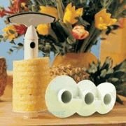 Fresh pineapple has a tropical, delicious taste … but many folks can’t figure out how to get past this fruit’s thorny exterior to the sweet inside and resort to buying those perfect little rings in a can. This pineapple slicer peels, cores, and slices a fresh specimen in less than 30 seconds so there is no excuse for ever buying canned pineapple again. To use this ingenious little tool, you must first cut the top off of your fresh pineapple. Next, place the slicer in the middle of the pineapple and push down while turning the handle in a clockwise motion. Pull the slicer straight out of the pineapple and--voila!--your perfect little rings come out with the tool while the rough shell stays behind. Finally, simply slide the handle off the slicer and the pineapple rings slide off with it. The pineapple shell remains intact so you can use it as a dessert bowl or as a glass for piña coladas. The slicer comes with three blades to tackle pineapples of any size. This tool has garnered several prestigious design awards from all over the world, including Germany’s Award for Good Industrial Design, Holland’s ION’s Good Industrial Design award, and Japan’s MITI Award for Excellent Foreign Product. --Cristina Vaamonde